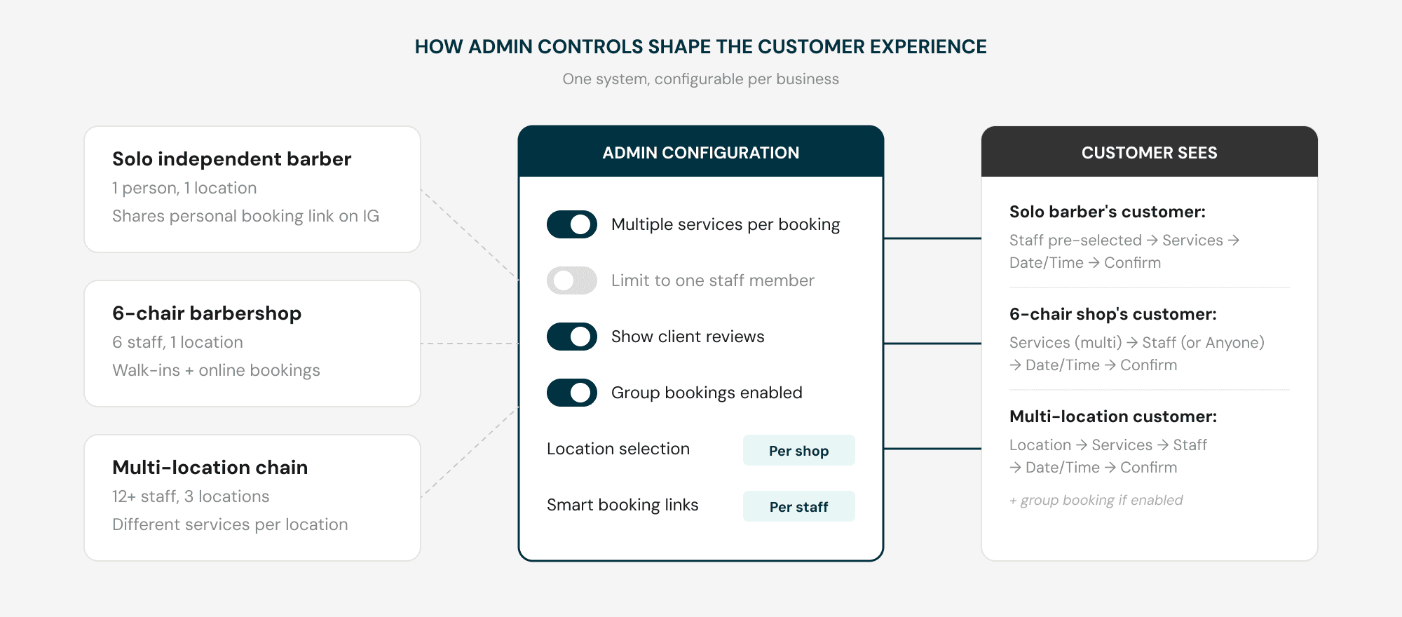 The customer-facing flow was only part of the problem, barbershop owners also needed control over how their booking page worked, and those needs vary widely by business size.