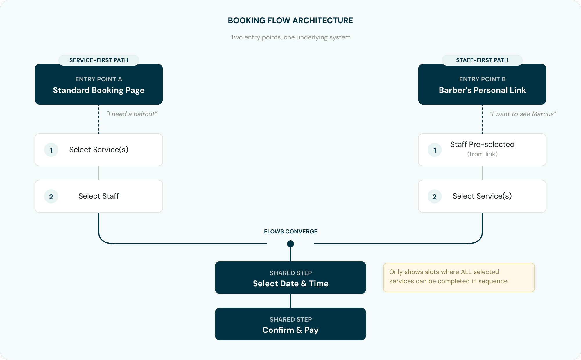 Service-first and staff-first paths enter the same underlying flow, no duplicate systems.