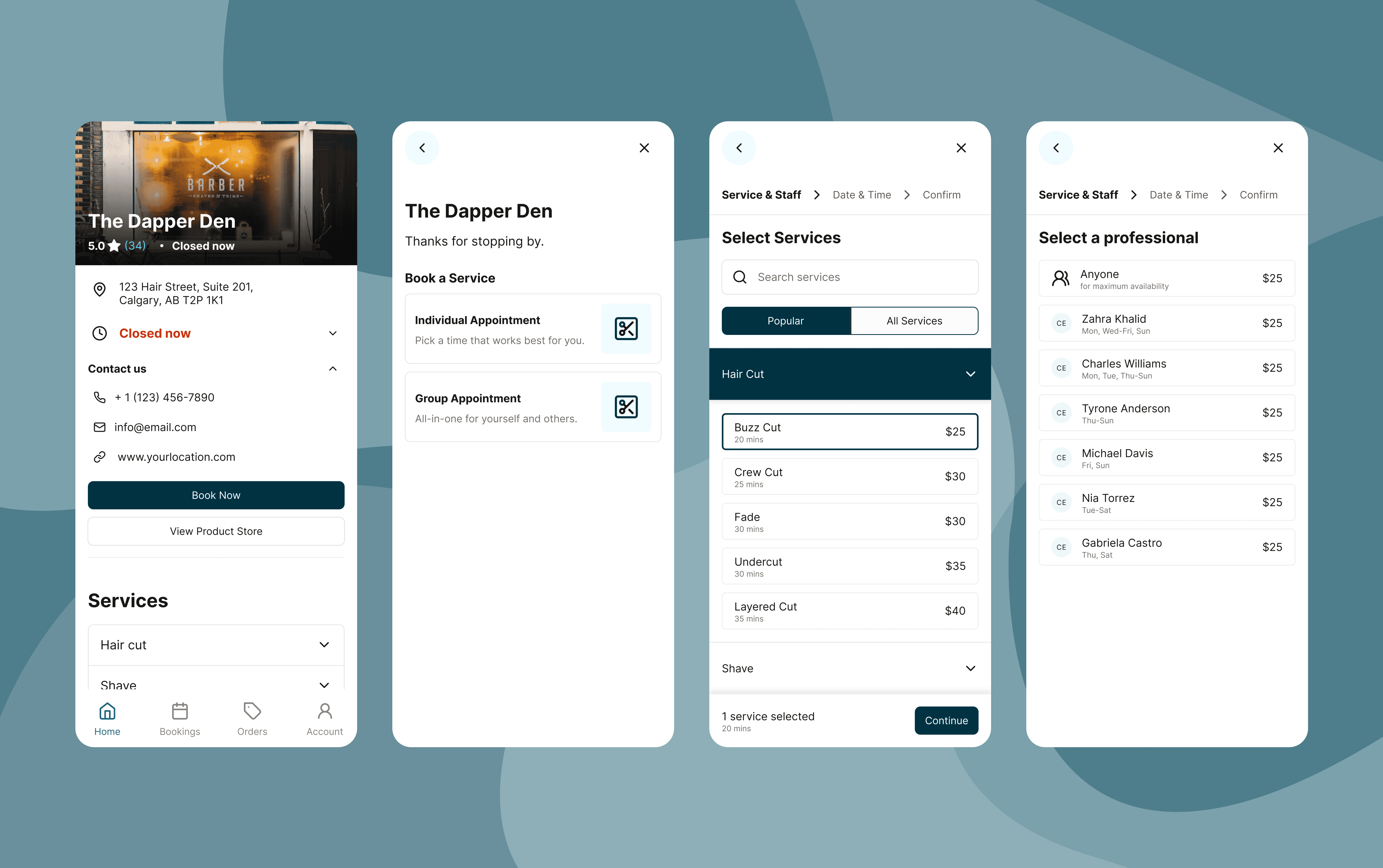 The core sequence — Service → Staff → Date & Time — follows a proven pattern. The real design work was in the flexibility and logic underneath it.