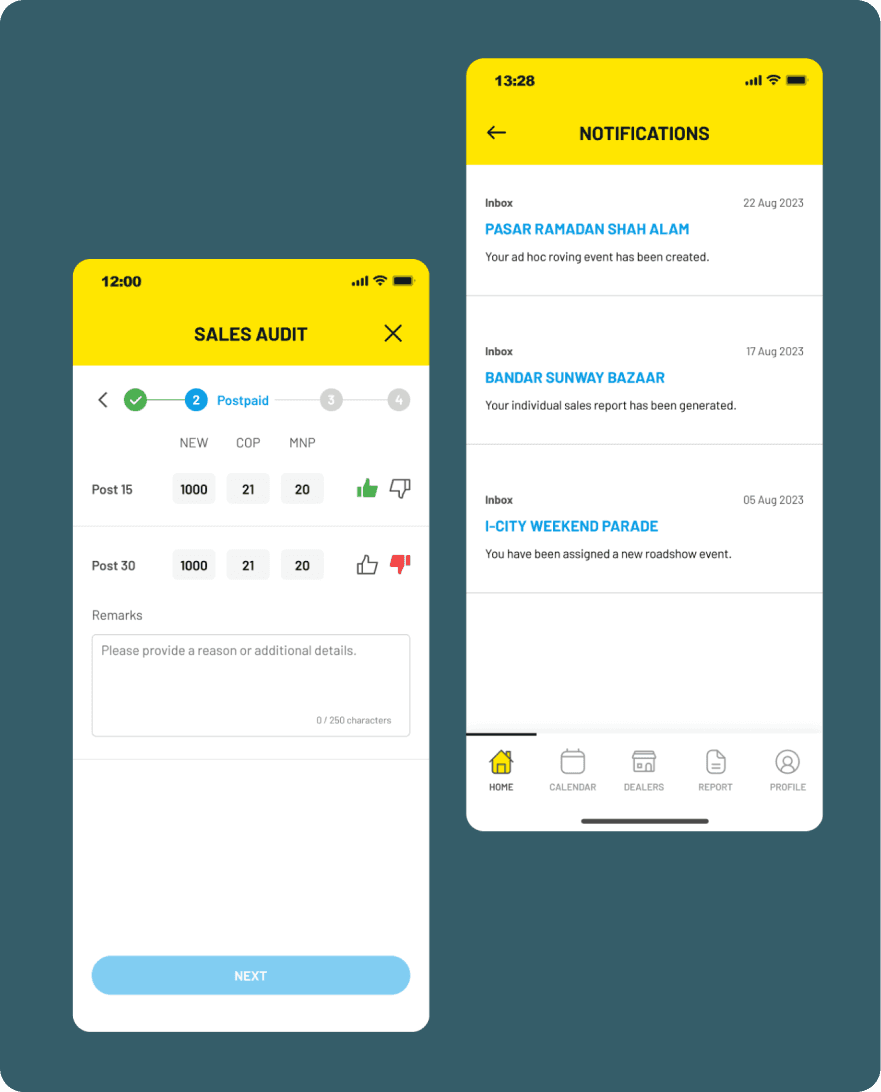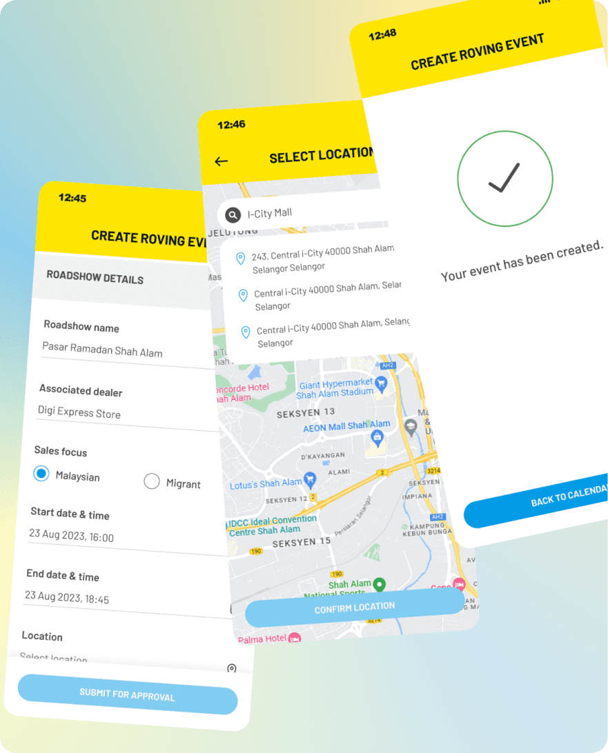 I conducted user testing to refine designs for optimal user satisfaction. Incorporating user feedback, we added a map feature for easier roadshow navigation and introduced a comment section for issue tracking in the sales executive app. These sessions also led to bigger discussions on streamlining sales input by integrating our solution with Digi’s POS system.